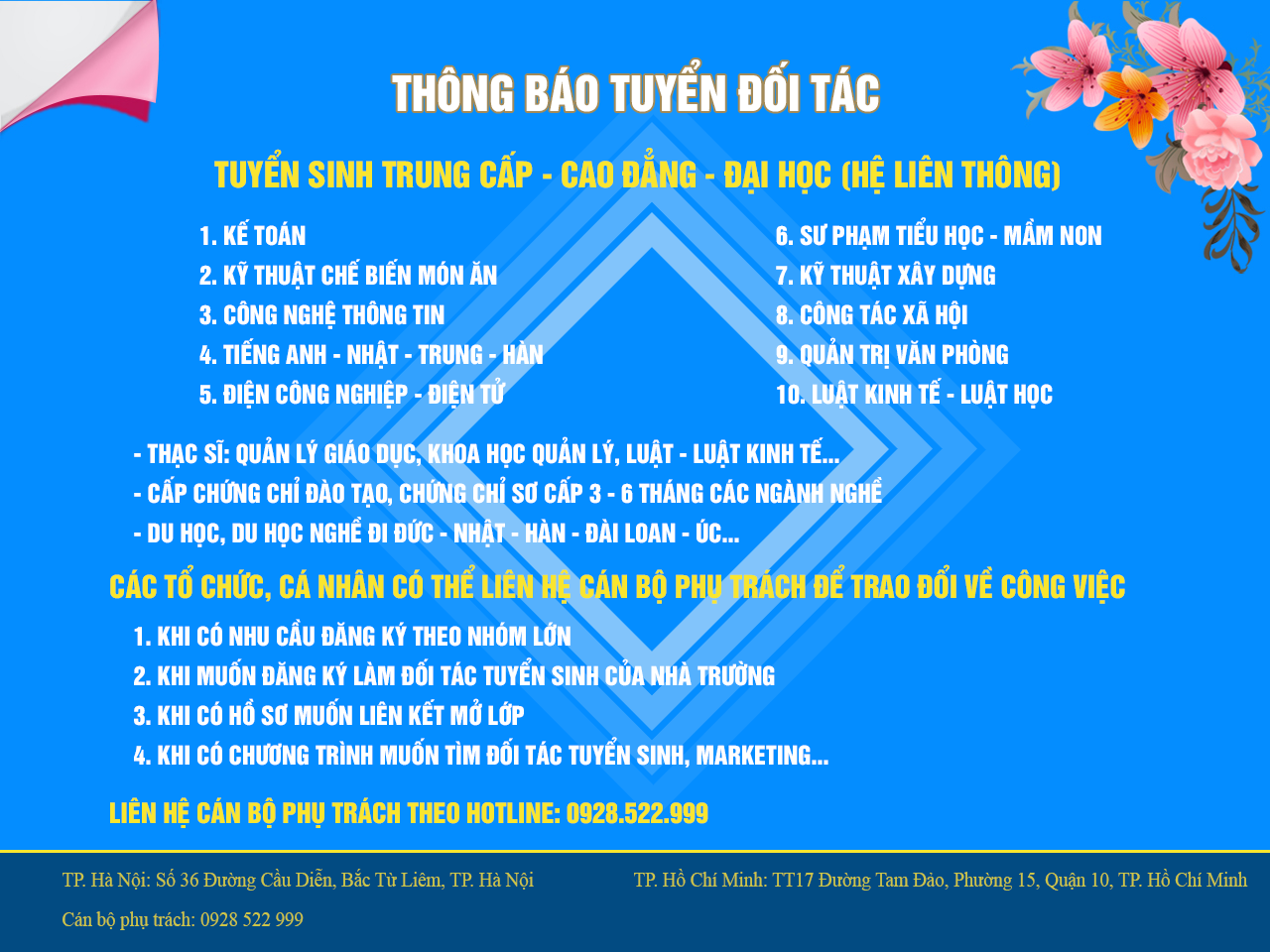 Có nhiều địa điểm hỗ trợ tuyển sinh và tiếp nhận hồ sơ trên toàn quốc. Tuy nhiên để đảm bảo quyền lợi của...