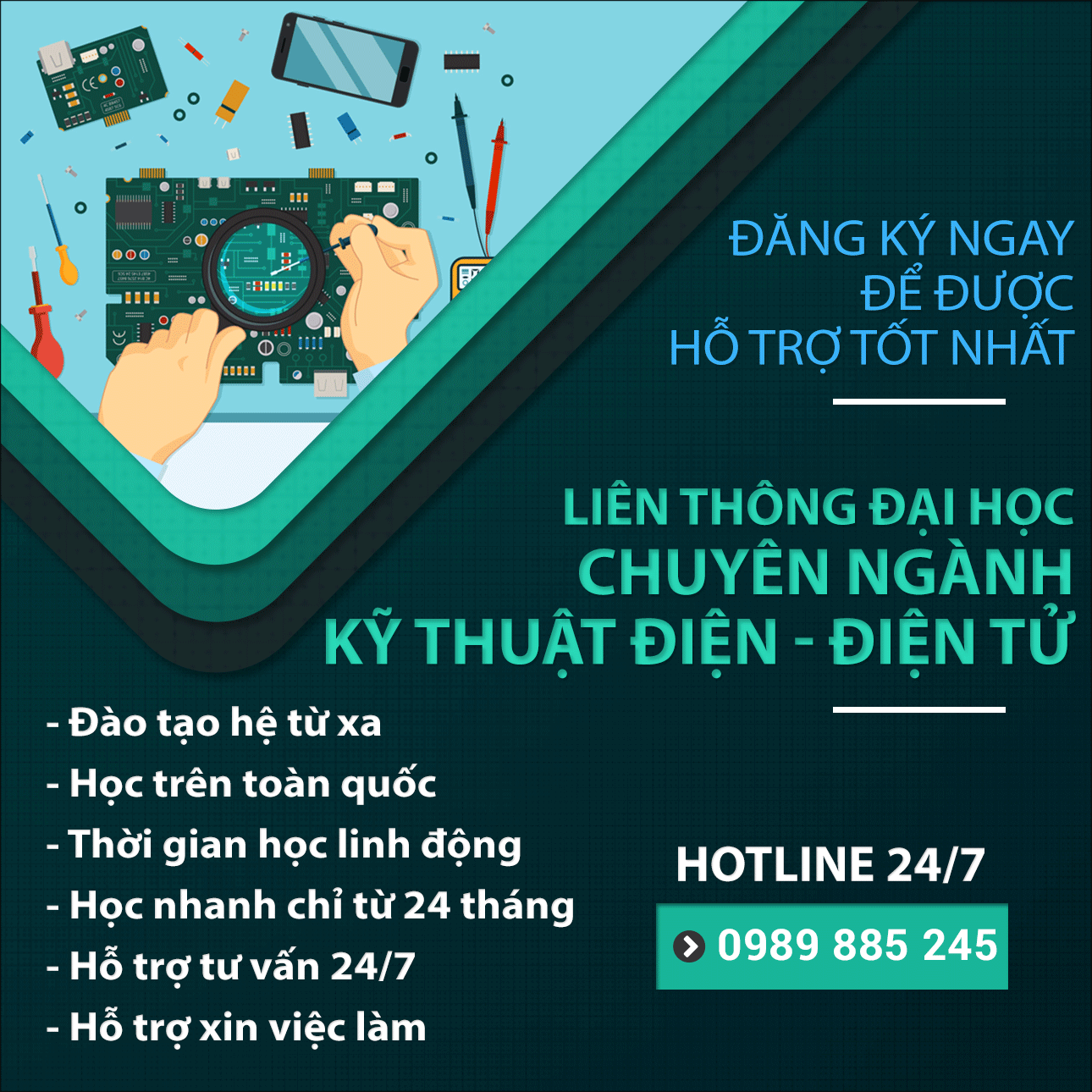 Liên tục xét tuyển học viên cho lớp Đại học chuyên ngành Công nghệ kỹ thuật Điện - Điện Tử hệ Từ xa. Tùy thuộc văn bằng đầu vào mà Học viên được sắp xếp thời gian học phù hợp: